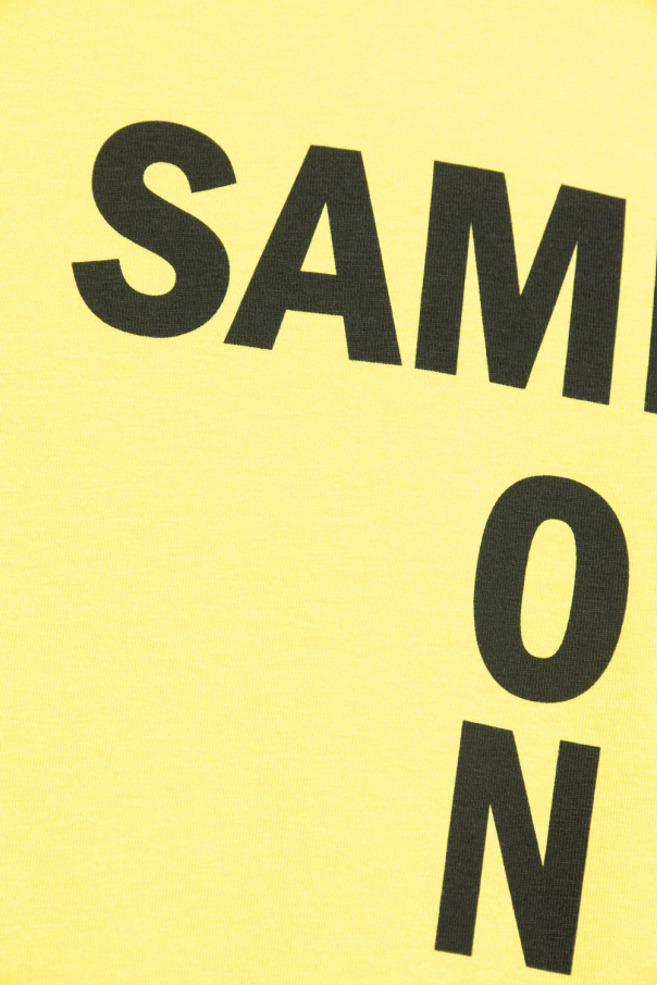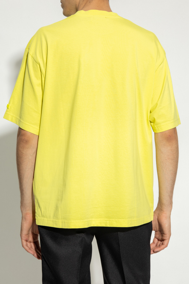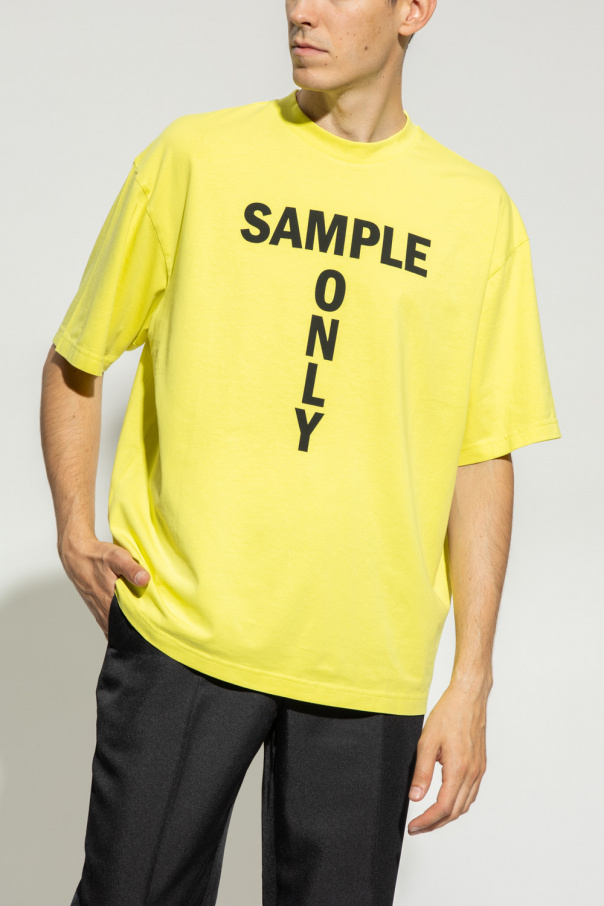 Neon yellow T-shirt from Acne Studios. Made of an organic cotton blend, this short sleeve design is enriched by black ‘Sample Only’ print and ribbed crew neck.