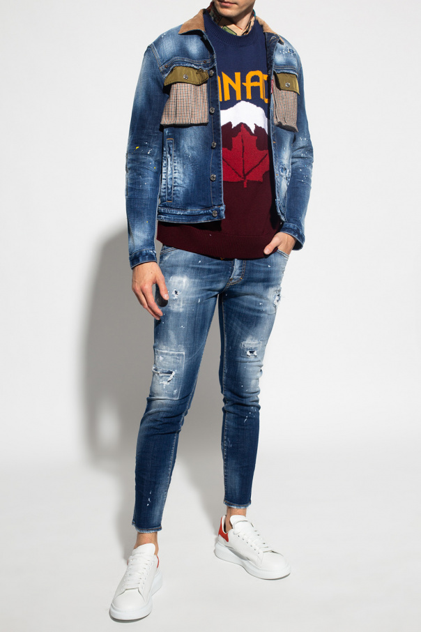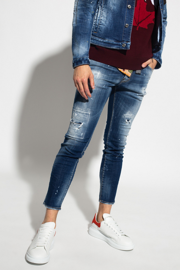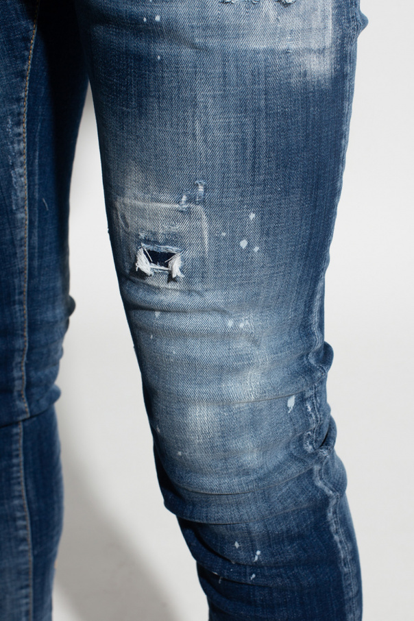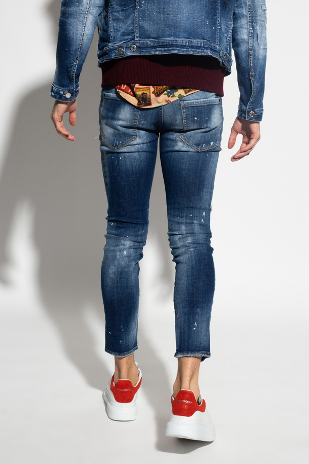Blue \'Skater\' jeans from Dsquared2. Crafted from stonewashed stretch-cotton denim with a skinny fit, this pair falls down with tapered legs and features button fastenings, frayed edges, yellow stitching details and white paint splatters.