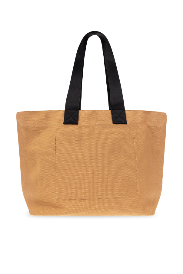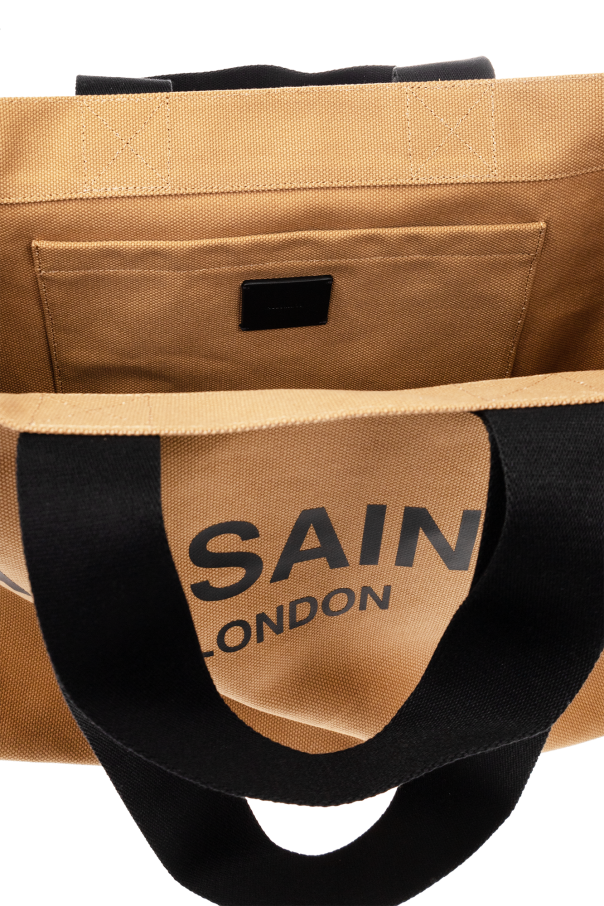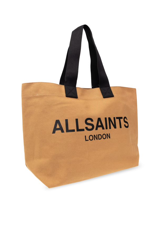 Brown ‘Ali’ shopper bag from AllSaints. Crafted from cotton, this design features a black logo print, two half-round handles, two half-round shoulder straps and one internal compartment with one slip pocket.
