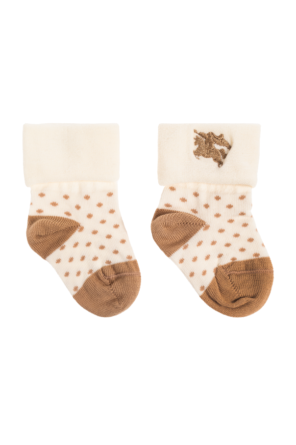 2-pack of socks in cream and beige from Burberry Kids. Made of cotton, each pair features a logo embroidery and folded ribbed cuffs. One pair decorated with polka dots.