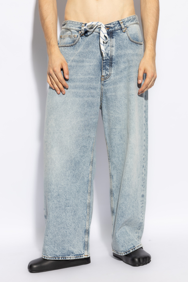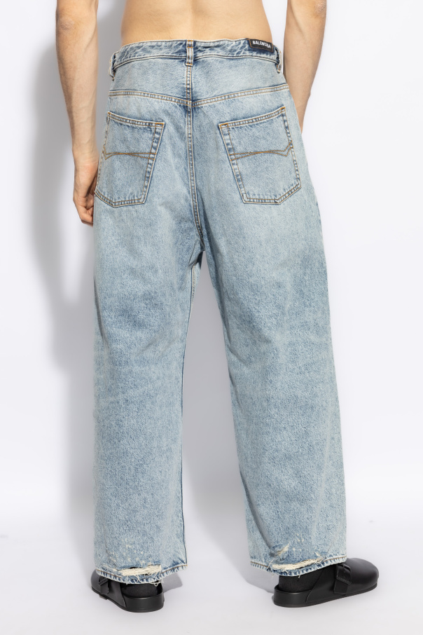 Introducing a timeless piece from the innovative atelier of Balenciaga: the Relaxed Tapered Jeans. Crafted with the highest quality 100% cotton denim, these jeans exude a vintage charm, blending effortlessly into both contemporary and retro wardrobes. The dominant light blue hue, accentuated by strategic fading and whiskering, creates an authentic, lived-in look that resonates with the spirit of classic denim. Designed to cater to the modern silhouette, these jeans feature a relaxed fit through the hips and thighs, tapering gracefully towards the ankle. This combination ensures both comfort and style, offering a flattering shape that suits a variety of body types. The classic five-pocket design is elevated by distinctive back pocket stitching, a hallmark of Balenciaga\'s keen attention to detail. Uniquely, these jeans also incorporate a drawstring waist alongside the traditional zip and button closure, offering an adjustable fit that does not compromise on style. The durability of the denim, illustrated by its robust texture and contrast yellow stitching, promises longevity, while the unique details such as rivets and pocket construction underscore the craftsmanship that has gone into each pair. The inclusion of a drawstring, a modern twist on a classic feature, hints at a blend of comfort with the bespoke fit, making these jeans a versatile addition to any wardrobe. Why Purchase This Product? Vintage Aesthetic: Achieve a timeless look with the faded and whiskered finish. Exquisite Craftsmanship: From the distinctive back pocket stitching to the durable denim fabric, every detail is meticulously crafted. Comfort Meets Style: The relaxed, tapered fit offers a flattering silhouette without sacrificing comfort. Signature Balenciaga Detailing: Unique features such as the drawstring waist and contrast stitching add a contemporary edge to a classic design.