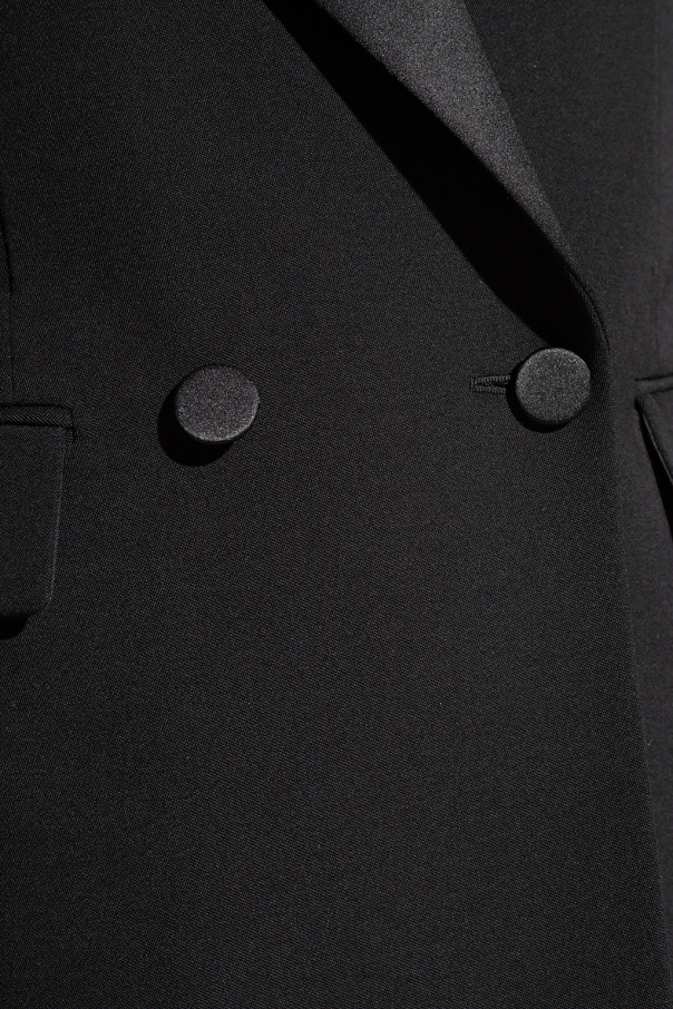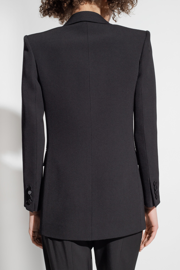 Black blazer from Saint Laurent. Made of wool, this style features a single button fastening, peak lapels, satin trims, a single back vent, a silk lining, three frontal pockets (two with flaps), and long sleeves.