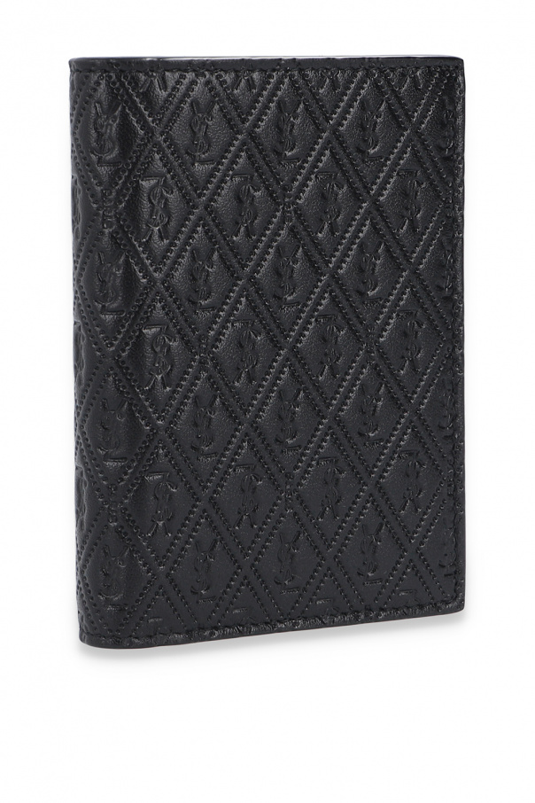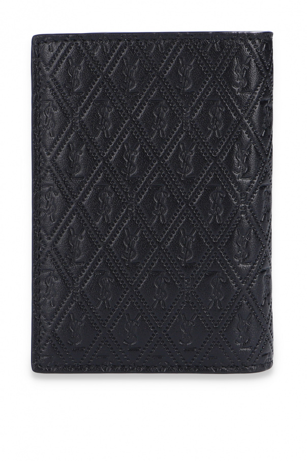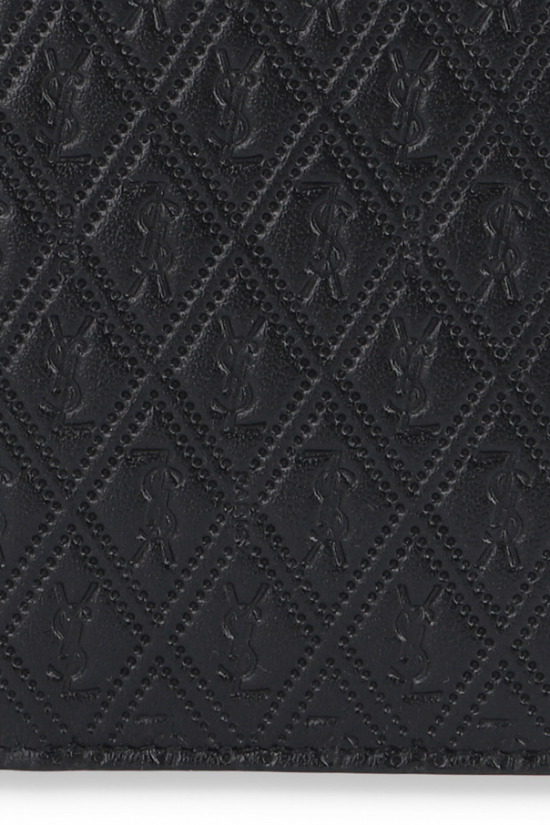 Black folding wallet from Saint Laurent. Made of leather with an all-over embossed monogram pattern, this item features five card slots and one bill compartment inside.