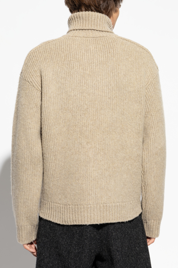 Introducing the Wool Turtleneck Sweater from Burberry, an epitome of refined elegance and warmth. This exquisite piece, rendered in a sophisticated shade of gray-beige, is crafted from a luxurious blend of wool and cashmere. The high turtleneck design ensures optimal warmth and comfort, making it an indispensable addition to your autumn and winter wardrobe. The sweater features long sleeves finished with ribbed cuffs, and a ribbed hem, providing a tailored fit that accentuates the body\'s natural contours. Intricate shoulder seams add a touch of structural sophistication, while the discreet metal logo on the lower left side subtly signifies its prestigious origin. Perfectly pairing with wide, dark trousers and a beige overcoat, this turtleneck is a versatile piece that effortlessly transitions from casual to elegant settings. Its slip-on design, free from visible fastenings, enhances its sleek, minimalist aesthetic. Why Purchase This Product? Material Excellence: Crafted from a premium blend of wool and cashmere for unparalleled warmth and softness. Timeless Design: High turtleneck and ribbed details ensure both style and functionality. Brand Prestige: Embellished with Burberry\'s iconic metal logo, reflecting its esteemed heritage. Versatile Styling: Complements a range of outfits, from casual to formal attire. Comfort and Fit: Slip-on design with ribbed cuffs and hem for a snug, comfortable fit.
