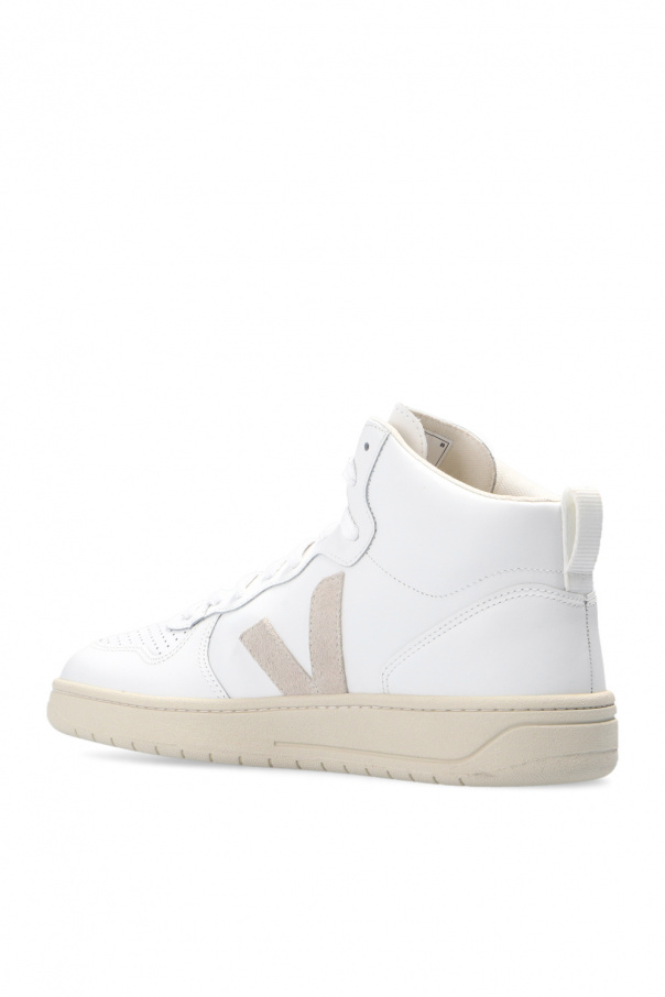White ‘V-15 Leather’ lace-up high-top sneakers from Veja. Crafted from leather, this lace-up pair sits on a cream rubber sole made of organic and recycled materials and is enriched by a logo embossed on the tongue, perforations, organic cotton laces and a beige logo patch made of suede. The mesh inner lining made from recycled materials was developed to acquire a better resistance to friction. The organic-sourced and recycled insole is made from sugar cane, Amazon rubber, organic cotton and recycled EVA foam. The leather comes from farms in Rio Grande do Sul and is L.W.G. Gold certified by the Leather Working Group, which promotes sustainable practices that have a positive impact on the environment in tanneries.