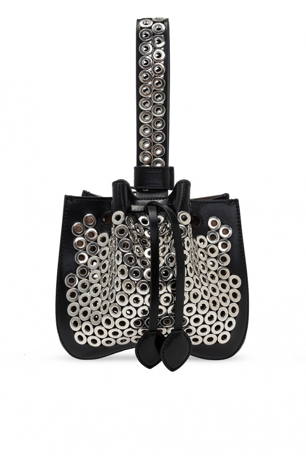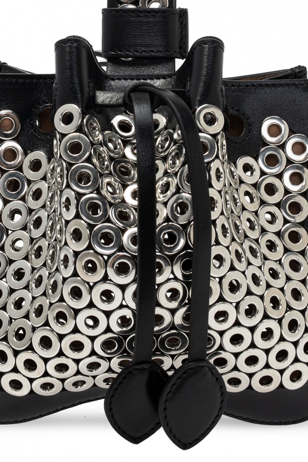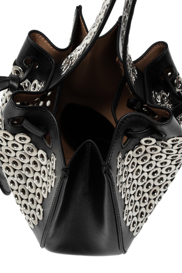 Black ‘Rose Marie 16’ hand bag from Alaia. Crafted from calf leather, this design displays the laser-cut pattern with stud detailing. It also features drawstring fastening, a half-round handle and interior with one compartment.