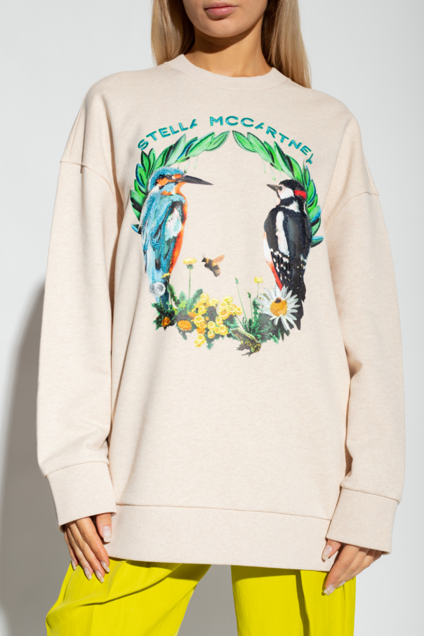 Light beige crewneck sweatshirt from Stella McCartney. Crafted in part from recycled cotton, this style features graphic embroidery with a colourful fauna & flora motif and the brand\'s logo, long sleeves and ribbed trims on the collar, bottom hem and cuffs.