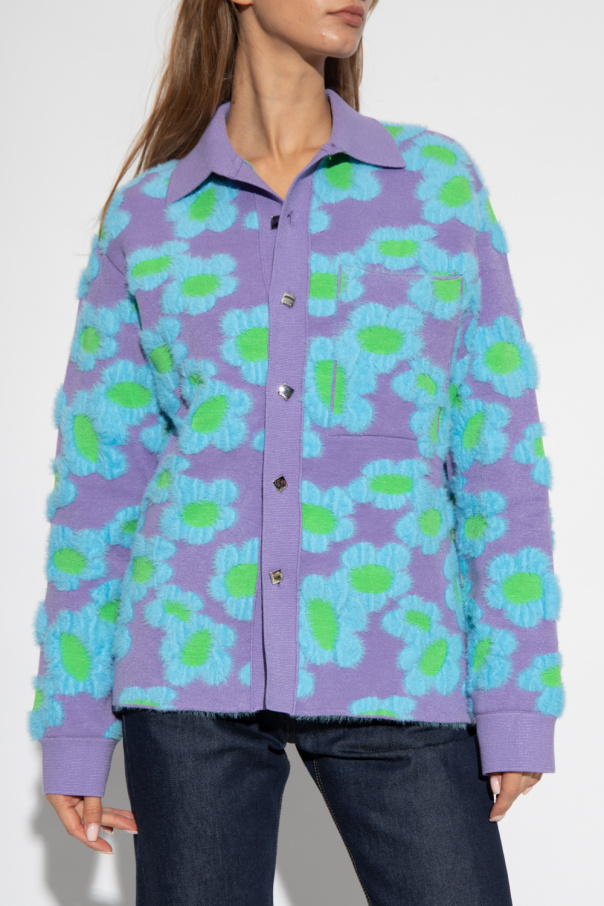 Purple ‘Neve Fleurs’ overshirt-style cardigan from Jacquemus. Crafted from heavyweight knit with an oversize silhouette, this style showcases a blue and green embroidered floral pattern with a fluffy trim. It is complete with silver-tone button fastenings with an engraved logo, a classic collar, a slip chest pocket and long sleeves with elasticated cuffs.