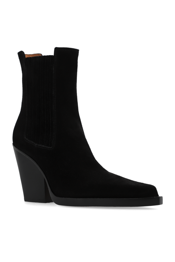 Black ‘Dallas’ heeled ankle boots from Paris Texas. Crafted from suede, this slip-on pair features decorative elastic side panels, a pointed toe and cream leather sole.