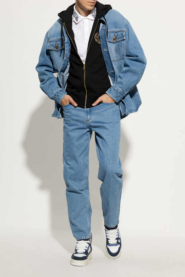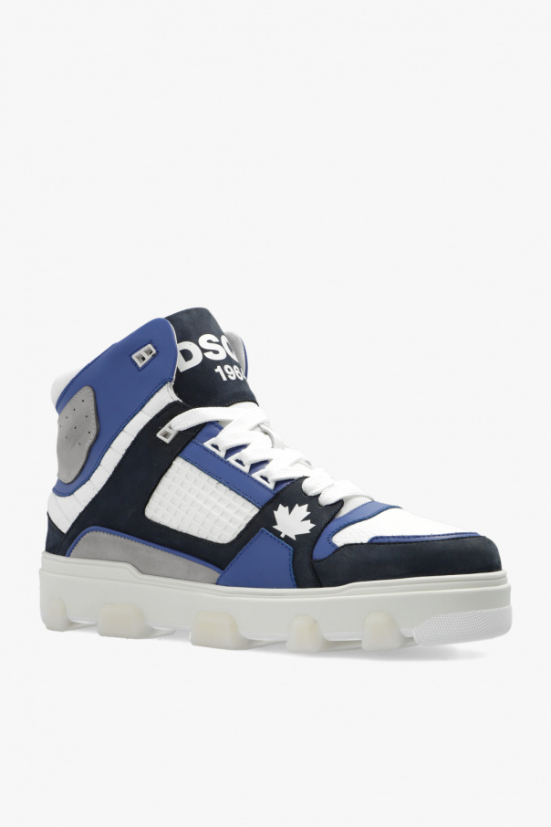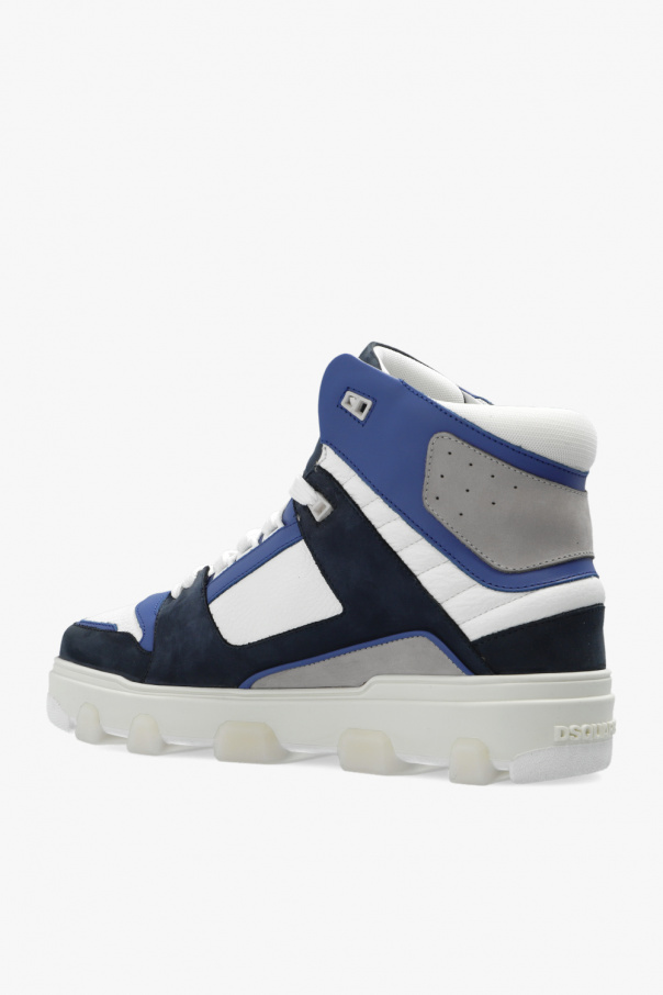 White, navy blue and grey ‘Basket’ high-top sneakers from Dsquared2. Crafted from leather and fabric with a high-top silhouette, this lace-up model sits on a white rubber sole and features a white logo print for brand recognition.