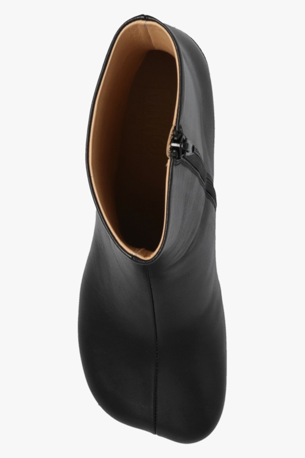 Black heeled ankle boots from MM6 Maison Margiela. Crafted from leather, this model showcases the brand's iconic ‘Tabi’ split-toed design, a zip fastening and a beige leather sole.