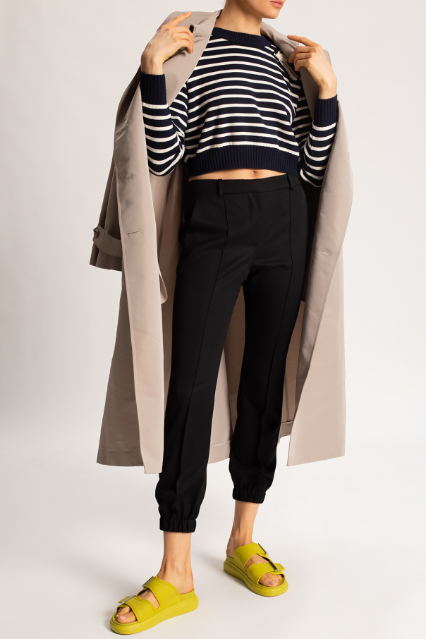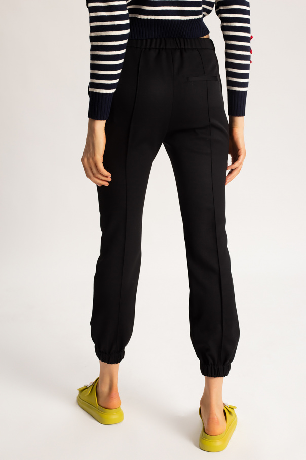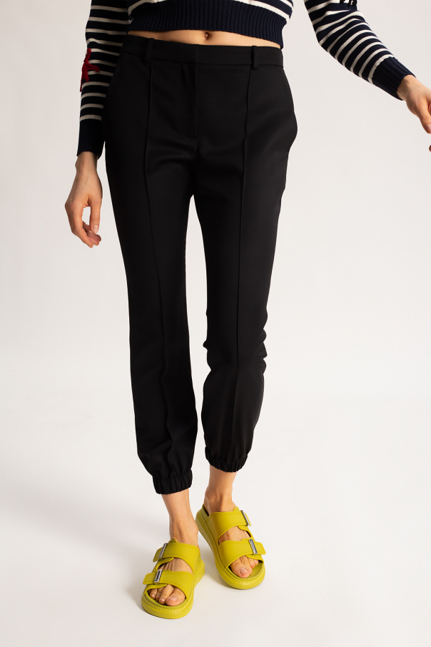 Black trousers from Alexander McQueen. Cut from wool to a tailored silhouette with a pressed crease on the front, this pair features a zip fly, a hook and button fastenings, two side seam pockets, one back welt pocket and ribbed cuffs.