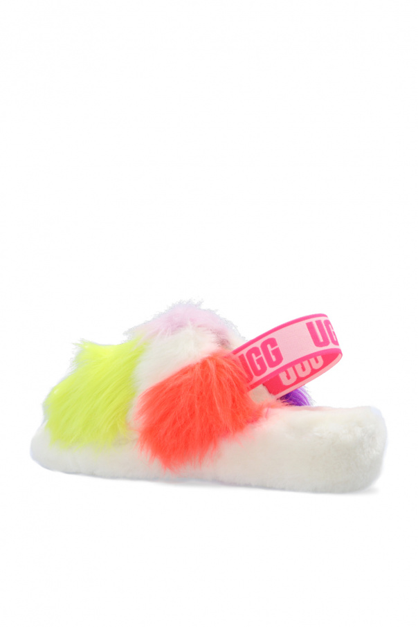 White ‘Fluff Yeah’ sandals from UGG. Made of plush shearling, this pair features the ‘Party Spots’ pattern, an elastic white strap embroidered with a pink logo and rests on a white rubber sole.