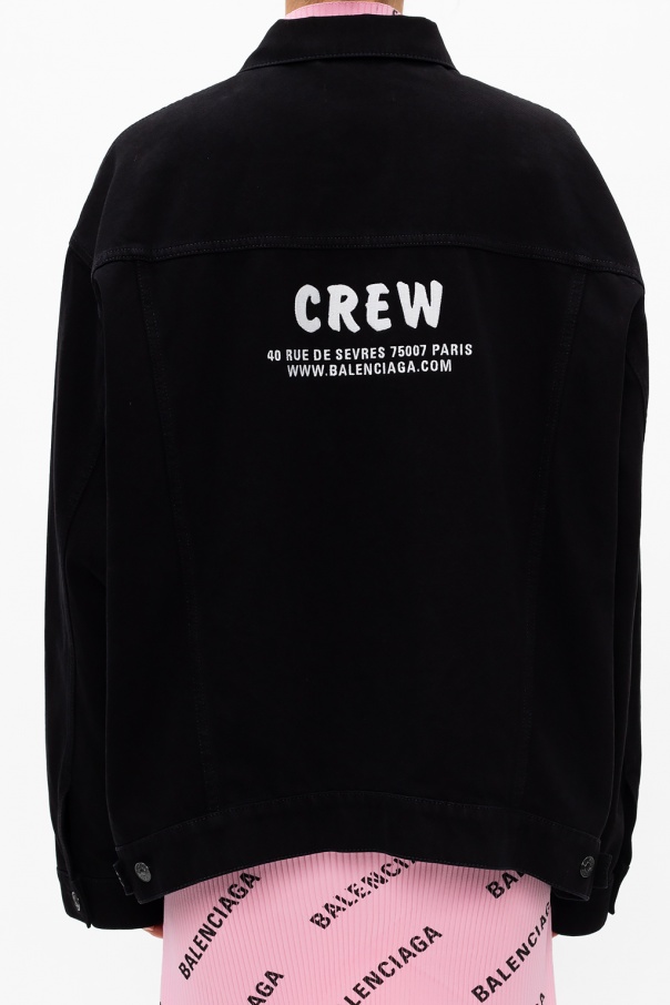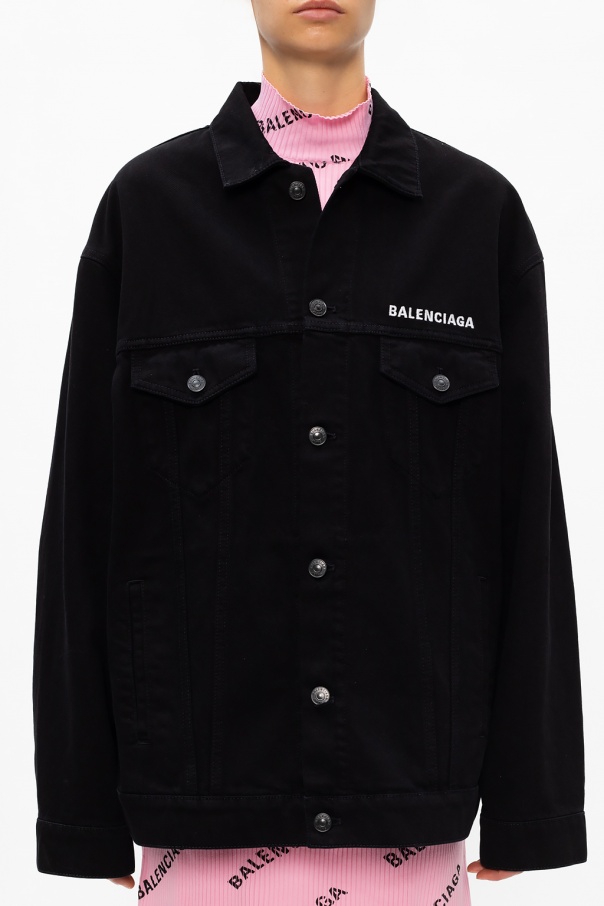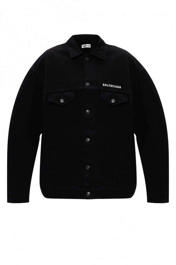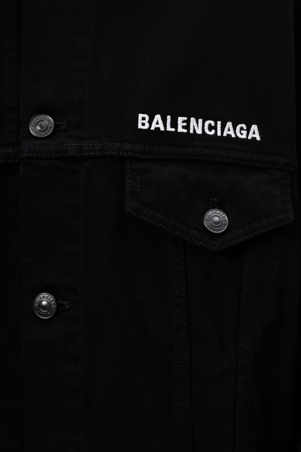 Black denim jacket from Balenciaga. This design employs button fastening, two front flap pockets with button fastening, two slip pockets and is enriched with embroidered lettering and a white logo.