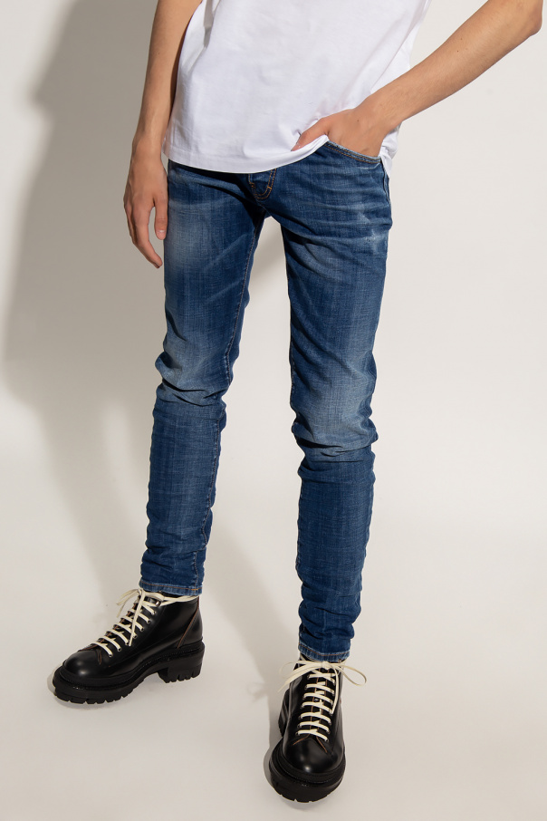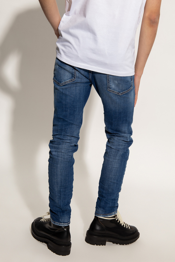 Blue ‘Cool Guy’ jeans from Dsquared2. Made of cotton, this pair falls with tapered legs and features button fastenings, classic five pockets, a distressed treatment and a beige patch with an embossed logo at the back.