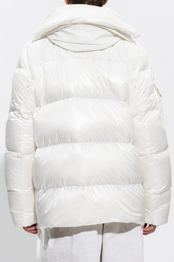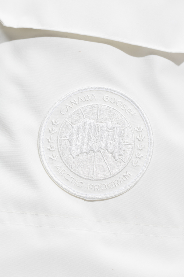 White down jacket from Canada Goose. Assembled from fabric panels, this style secures with a two-way zipper and snaps and features a drawcord-adjustable hood with a rigid brim and a detachable insert, multiple pockets, a logo patch on the front, zip vents on the sides, internal suspenders and long sleeves with elasticated cuffs.