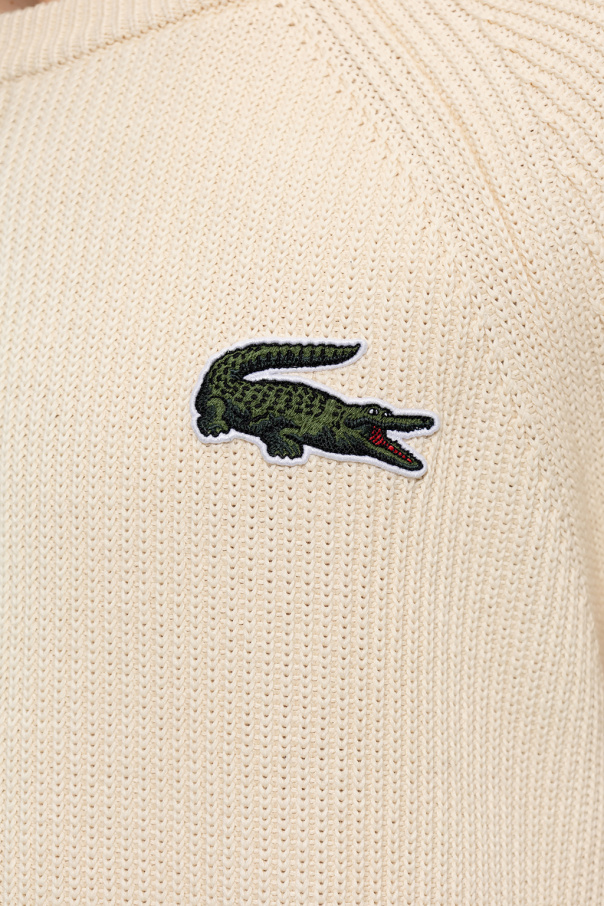 Beige crewneck sweater from Lacoste. Crafted from a cashmere and organic cotton blend, this style features a logo-shaped patch on the front and ribbed trims on the collar, bottom hem and cuffs.