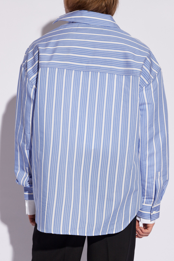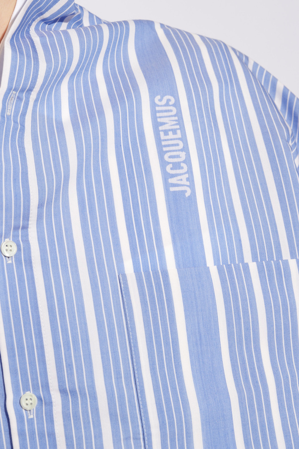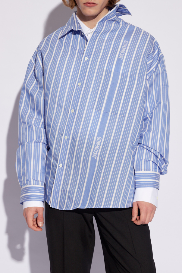 Blue and white ‘Cuadro’ shirt with a collar from Jacquemus. Crafted with a relaxed, asymmetrical silhouette, this style showcases a stripe pattern, logo detailing, one chest pocket, button fastenings and long sleeves with button cuffs.