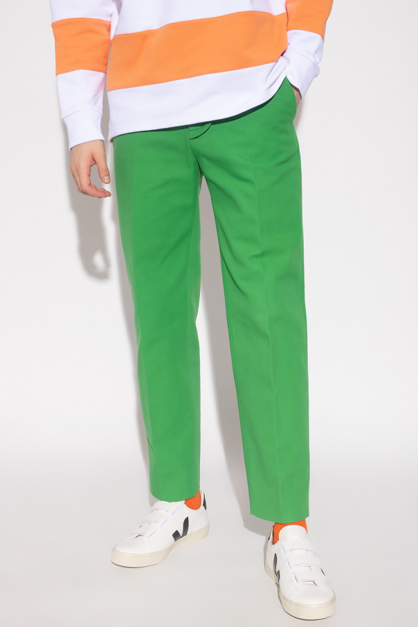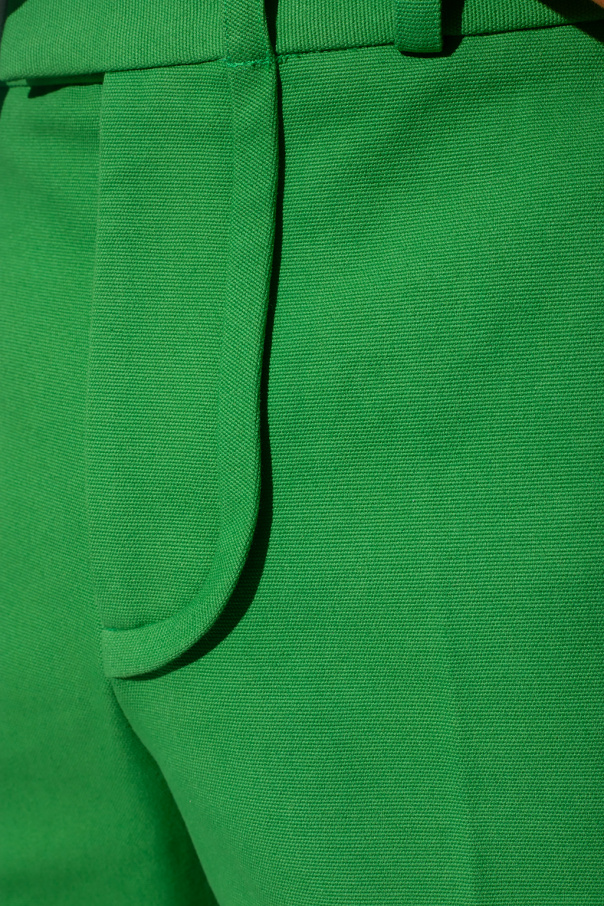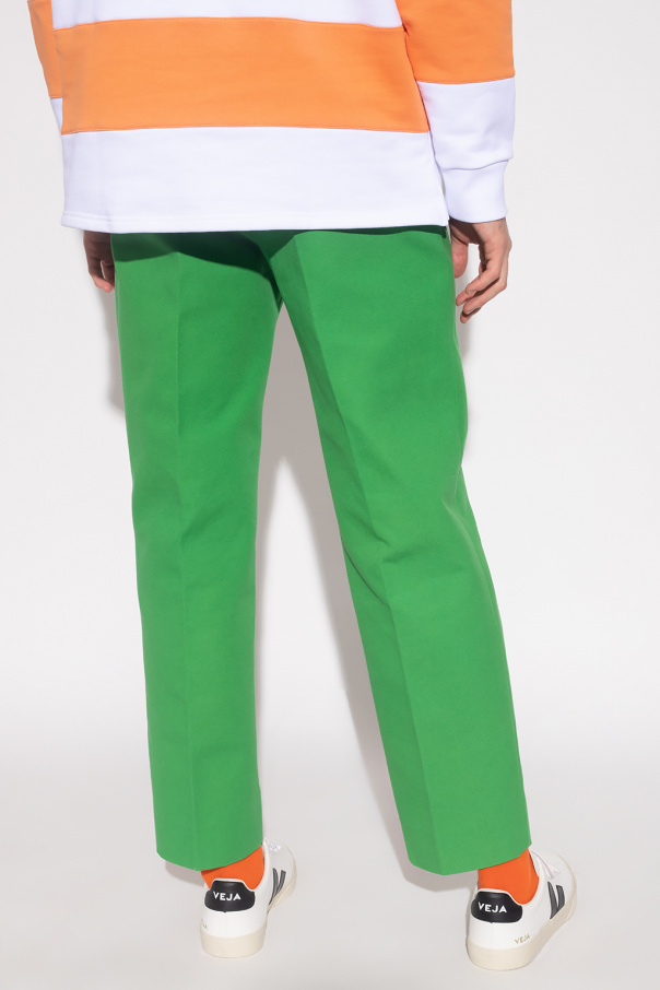 Green pleat-front trousers from Jacquemus. Made of cotton. Fastened with a zip and hook closure, this pair has four slip pockets and slightly tapered legs.