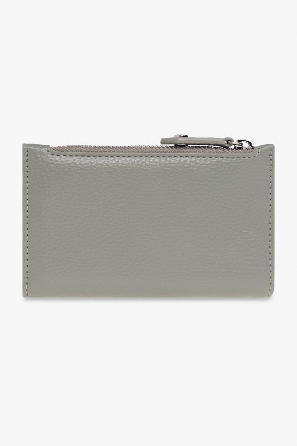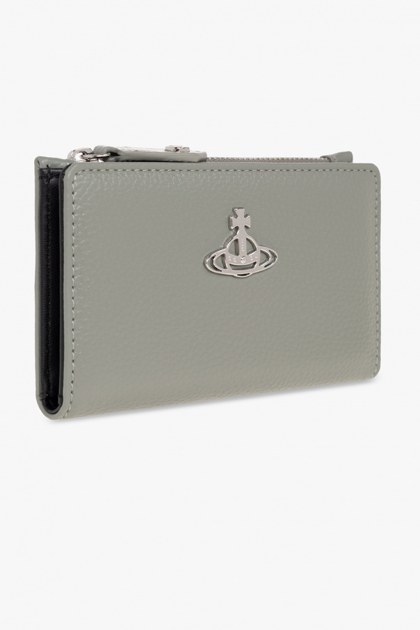 Greenish grey wallet from Vivienne Westwood. Crafted in part from recycled vegan leather, this design features a snap fastening, a silver-tone logo plaque, one zip coin pocket and six card slots and two slip pockets inside.