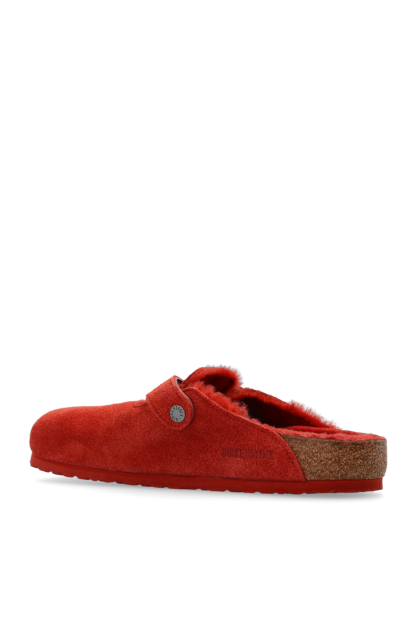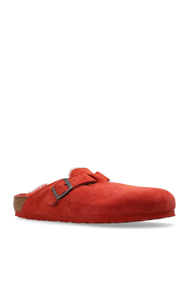 Red ‘Boston VL/ Shearling’ slides from Birkenstock. Made of suede and lined with lamb fur, this model sits on a red EVA foam sole and features an embossed logo on the side, an adjustable buckle strap and an anatomically shaped cork-latex footbed. Standard width.