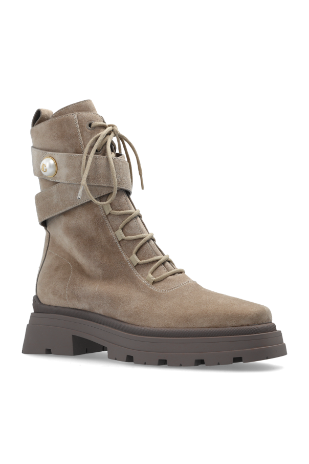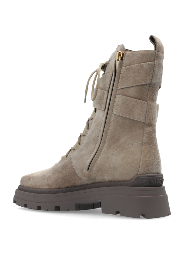 Introducing the epitome of sophistication and style - the Noemi ankle boots by Jimmy Choo. Crafted to perfection, these boots exude an aura of timeless elegance. The Noemi boots feature a classic shape that gracefully extends above the ankle. The front boasts exquisite lacing, enhancing both style and fit, while a wide strap adorned with a metallic button adds a touch of opulence. Expertly crafted from luxurious gray suede, the exterior epitomizes understated luxury. The robust rubber sole ensures impeccable grip and durability, making these boots as practical as they are stylish. Every detail is meticulously considered, from the decorative button on the outer strap to the convenient side zipper for effortless wear. The iconic logo graces the back of the sole, a testament to the boots\' distinguished pedigree. Why Choose This Product? Handcrafted by the renowned house of Jimmy Choo. Elegant gray suede exterior with a stylish lacing design. Durable rubber sole for excellent traction. Convenient side zipper for easy on and off. Decorative metallic button for a touch of sophistication. Signature logo on the back of the sole, signifying premium quality.