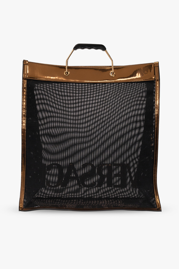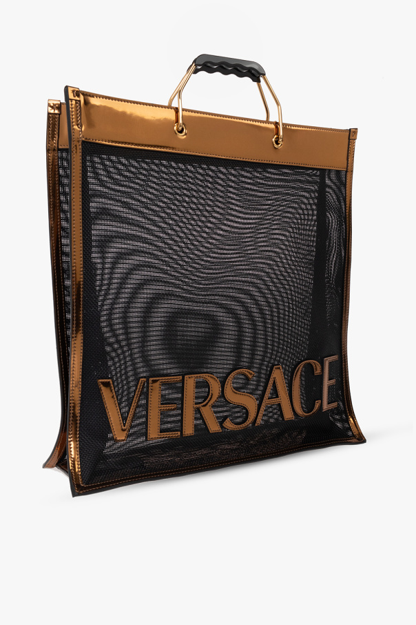 Black and gold-tone shopper bag from Versace. Crafted in transparent mesh and trimmed with glossy faux leather, this design showcases the brand\'s logo on the front, two metal handles and one internal compartment.
