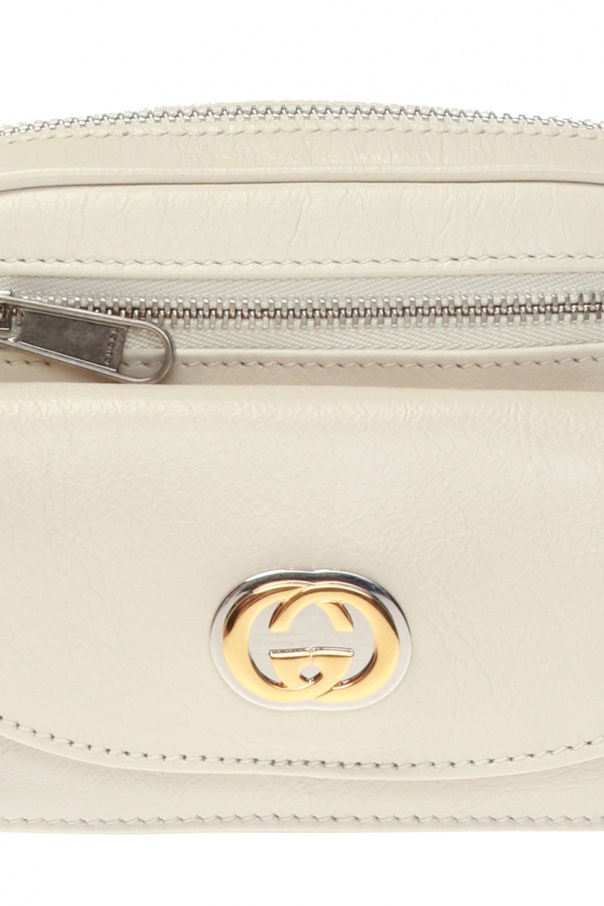 Cream belt bag from Gucci. Made of calf leather. Zip fastening. Metal logo, a zip pocket and a magnetic snap pocket on the front. Adjustable belt. One compartment inside. Silver-tone and gold-tone metal hardware.