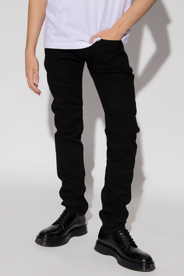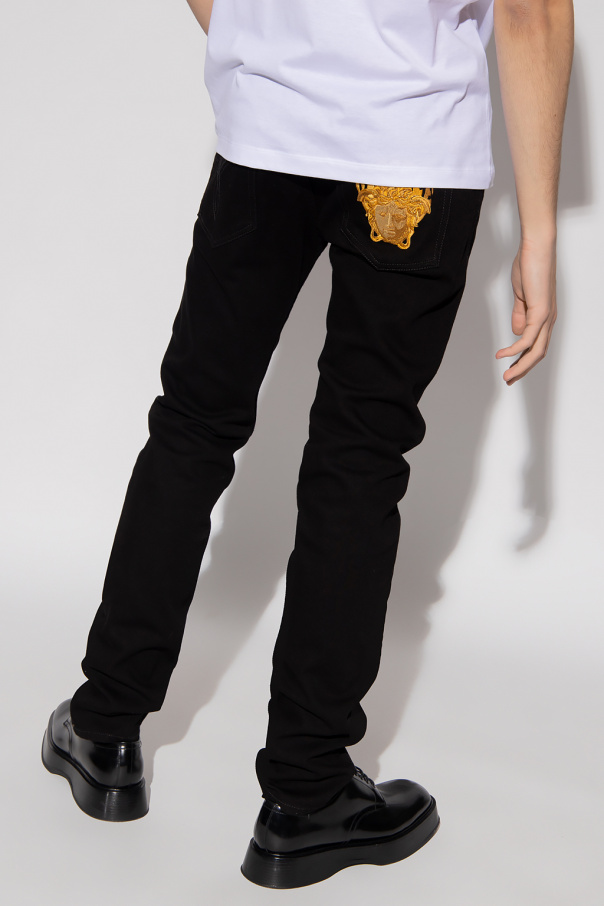 Black slim-fit jeans from Versace. Made of cotton with a touch of elastane, this pair falls with tapered legs and features a zip fly with a distinctive gold-tone button, classic five pockets as well as a brown leather patch with the brand's logo and its signature Greek motif and gold-tone Medusa embroidery on the back.