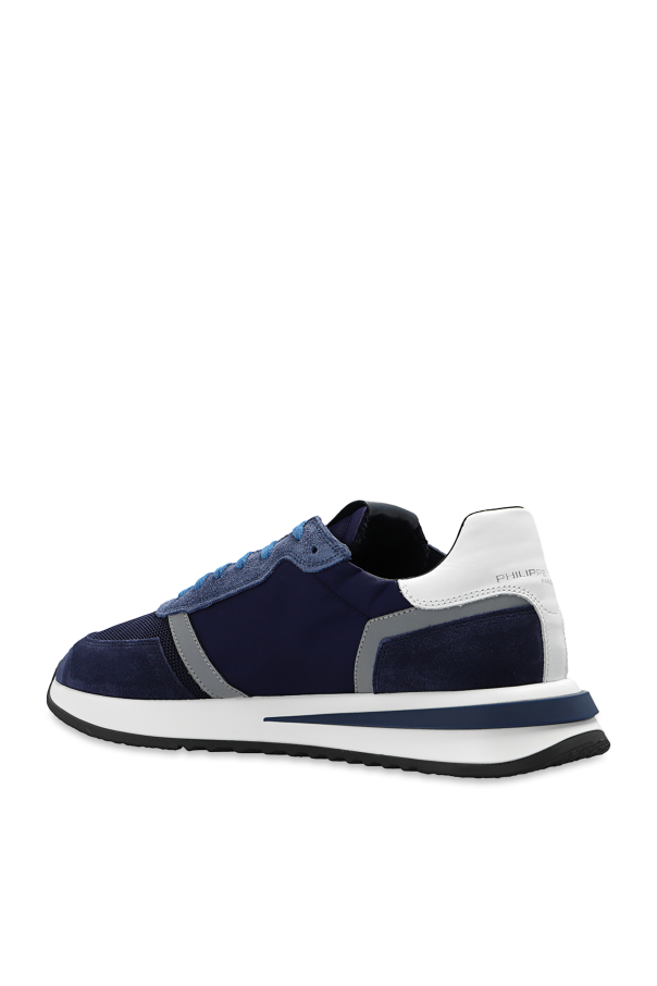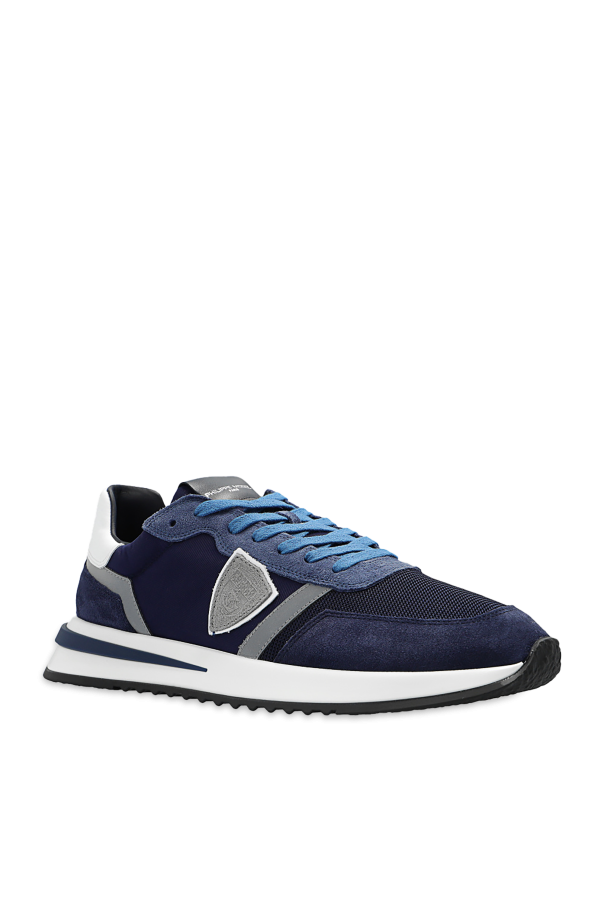 Navy ‘TROPEZ 2.1’ sneakers from Philippe Model. Made of suede, this lace-up pair features mesh trims, reflective details, silver-tone logo print, logo patch, white heel counter and rubber sole in black, white and navy.