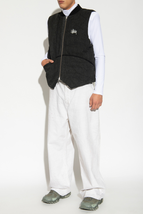 Black vest from Stussy. Crafted from washed cotton and padded with Primaloft® insulation, this style features an elasticated collar, a two-way zip fastening, two slip pocket and white logo embroidery on the front.