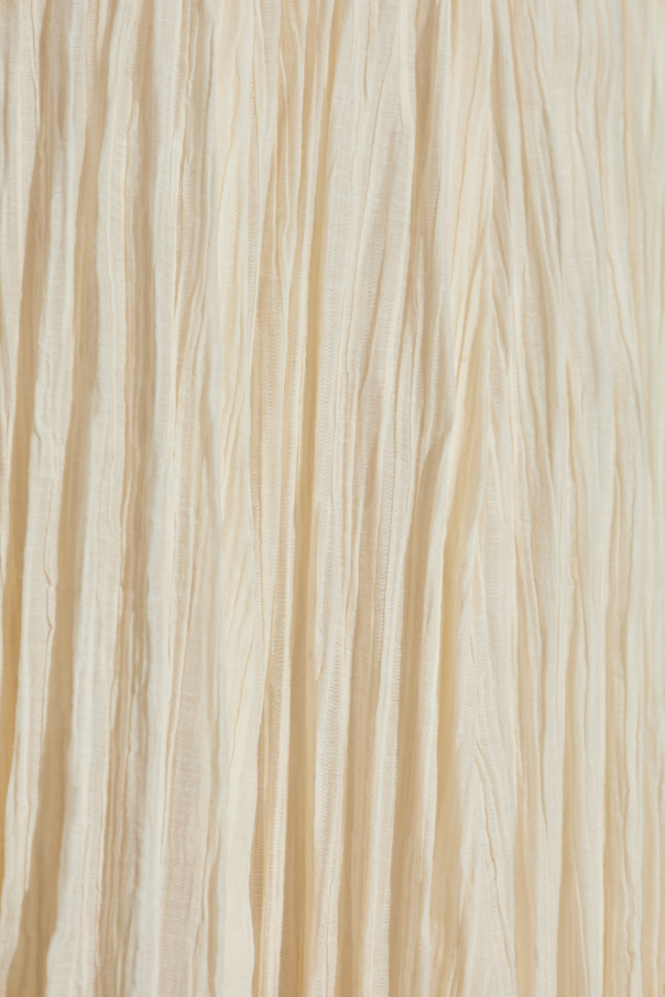 Introducing an embodiment of sartorial elegance and timeless sophistication, the Long Cream Pleated Skirt by TOTEME. Crafted from an exquisite blend of 72% Organic Cotton and 28% Polyamide, this skirt offers an unparalleled combination of durability and comfort, with a touch of environmental consciousness. The skirt\'s high-waisted design and meticulous pleating create a silhouette that is both flattering and enduringly stylish. The lightweight, airy fabric, likely chiffon or a similar fiber, ensures graceful movement and a delicate drape, while the evenly spaced pleats add volume and dynamic flow. Its creamy hue enhances its versatility, making it a splendid addition to any wardrobe, ready to be styled for various occasions. Attention to detail is evident in the skirt\'s construction, featuring a discreet zipper and hook closure, which maintains the garment\'s seamless elegance. Although devoid of conspicuous branding, this piece\'s quality and design speak volumes of TOTEME\'s dedication to understated luxury. A closer inspection of the fabric reveals a subtle texture and potential sheerness, suggesting the need for an appropriate underlayer to ensure modesty without compromising its breezy allure. Why Purchase This Product? Elegantly pleated design adds structure and movement. Lightweight, breathable fabric ensures comfort and a refined appearance. Versatile cream color allows for effortless pairing with diverse styling options. High-quality materials and construction, reflecting TOTEME\'s commitment to sustainability and luxury. Subtle closure system enhances the skirt’s flawless, uninterrupted flow.