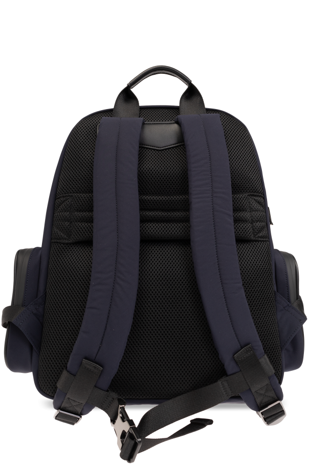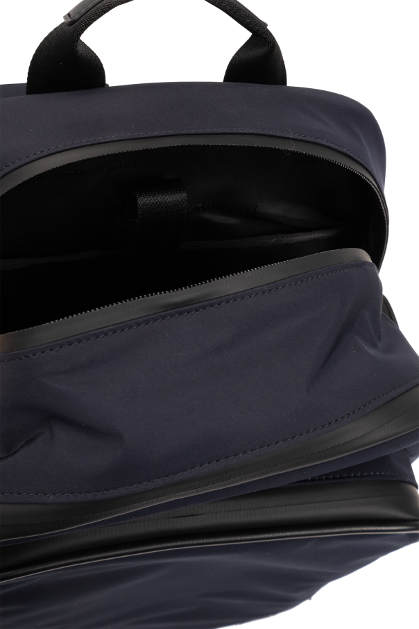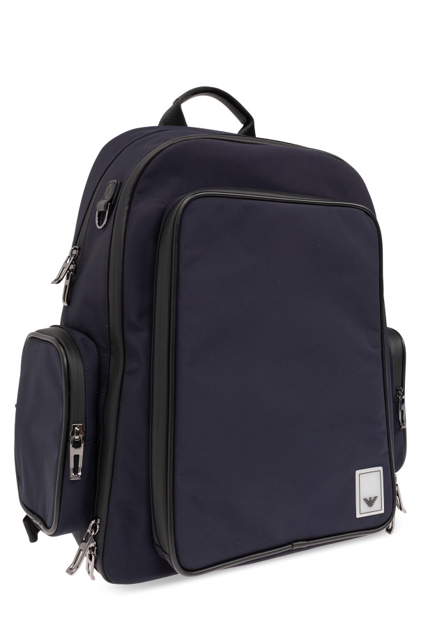 Navy blue backpack from Emporio Armani. Emblazoned with a logo patch, this design showcases a buckle fastening and adjustable shoulder straps on the back, one half-round handle, silver-tone metal hardware, side zip pockets as well as three compartments – inside you can find two laptop pockets, one zip pocket and multiple slip pockets.