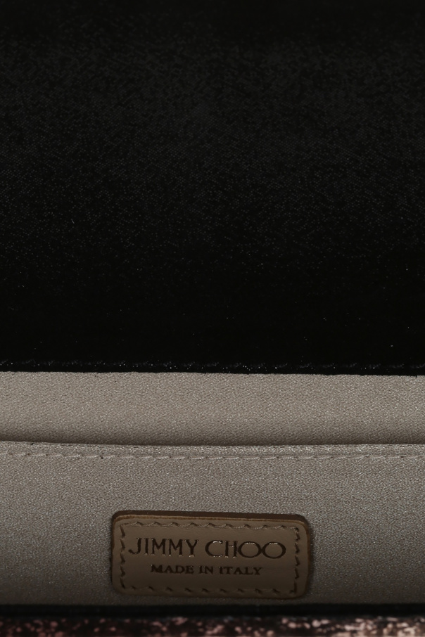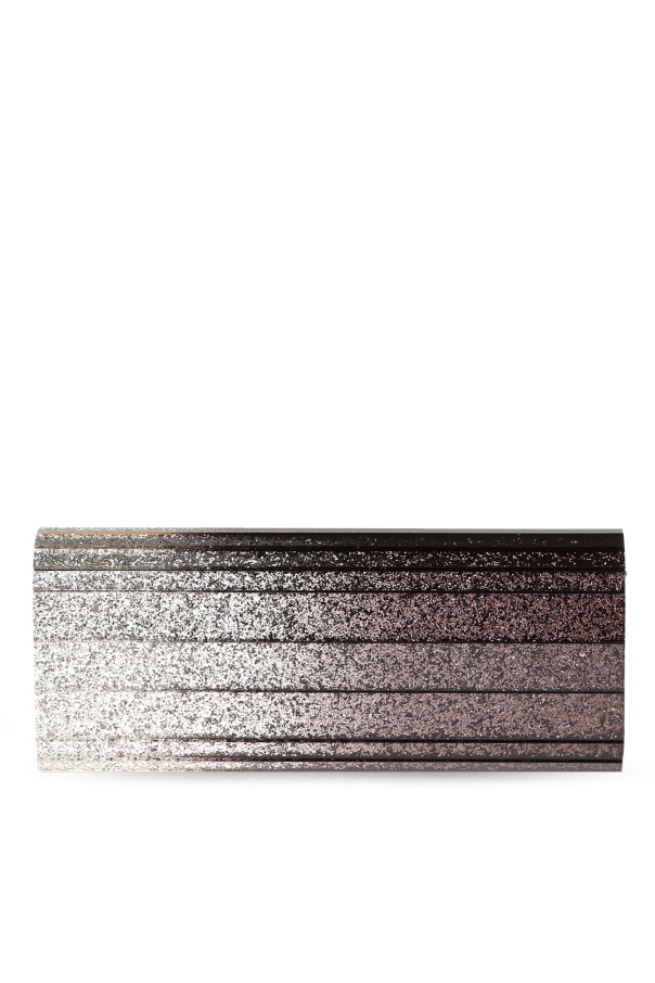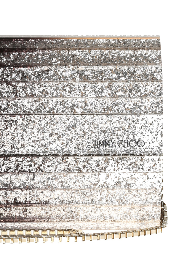 Glittery violet and silver-tone shaded acrylic oblong \'Sweetie\' clutch from Jimmy Choo with snap fastening. Small logo on the front. Long metal shoulder chain. Slip pocket inside.