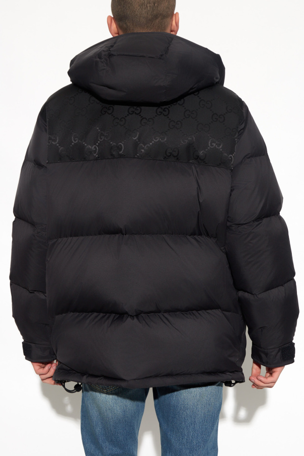 Black quilted down jacket from Gucci. Fastened with a zip, this design features a monogram pattern, detachable hood, two flap pockets, drawstring hem and long sleeves.