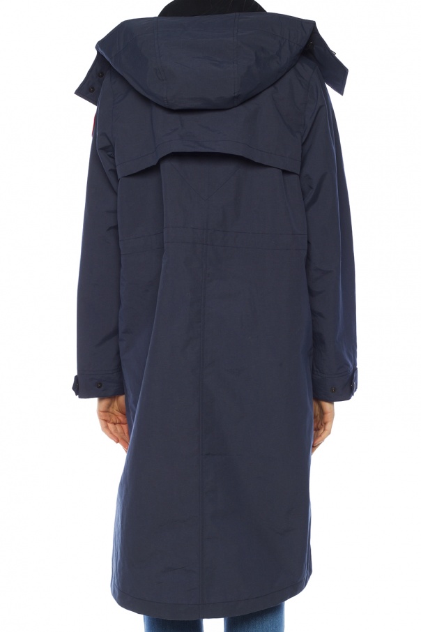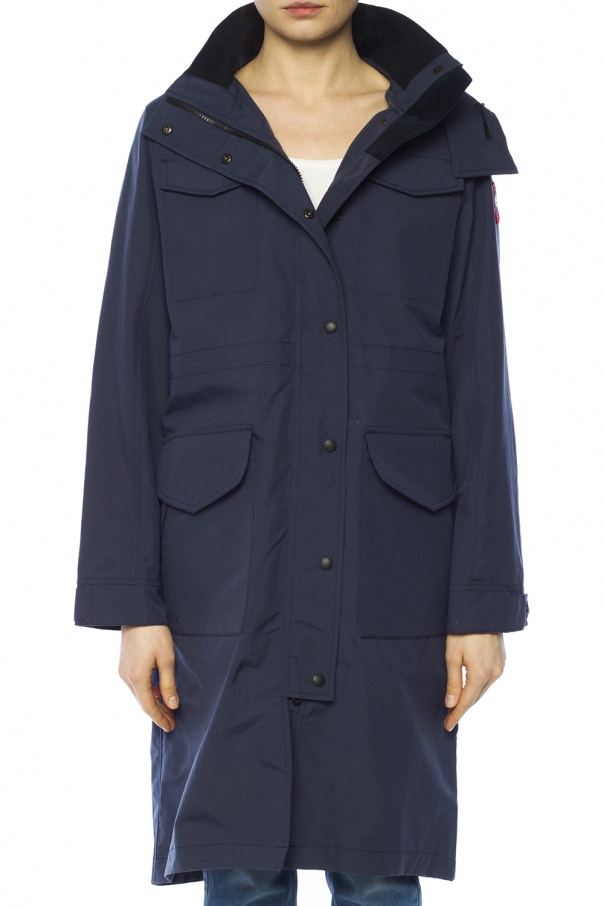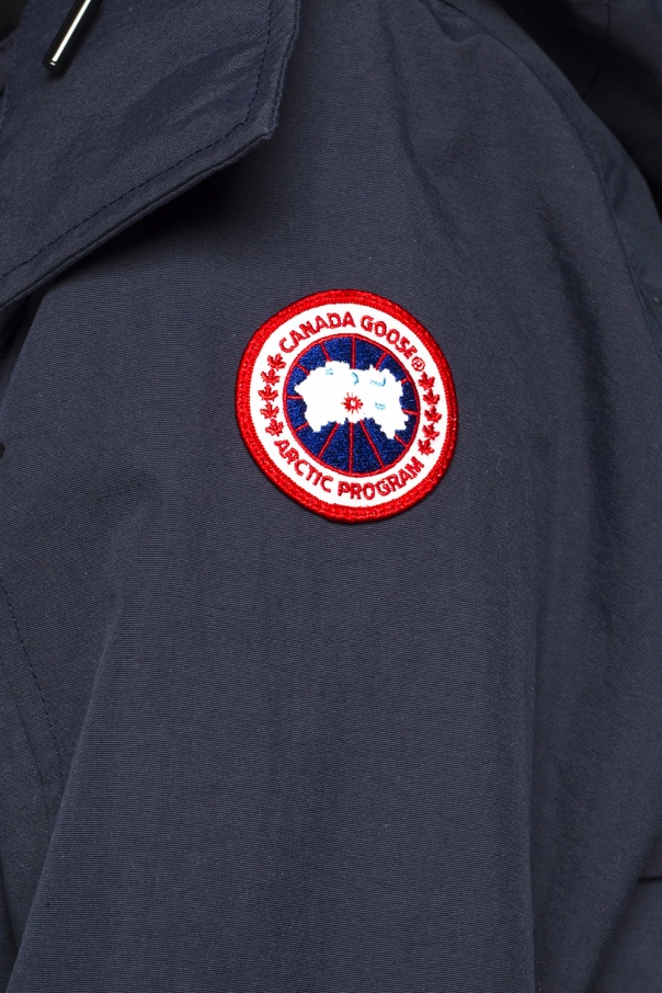 Navy and black \'Reid\' long hooded jacket from Canada Goose. Two-way zip and snap fastenings. Colourful patches with embroidered logo. 2 slip pockets and 4 snap fastening pockets at front. Detachable hood. Long sleeves with snap fastening cuffs. Black metal hardware. Temperature range 5°C to -5°C.