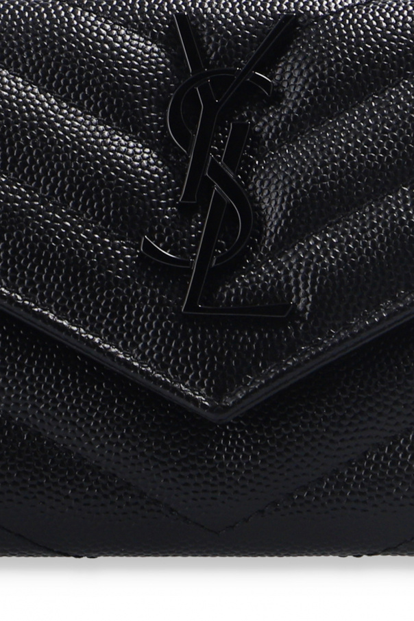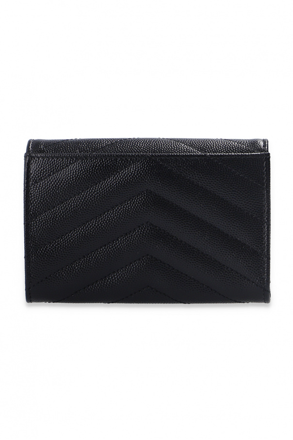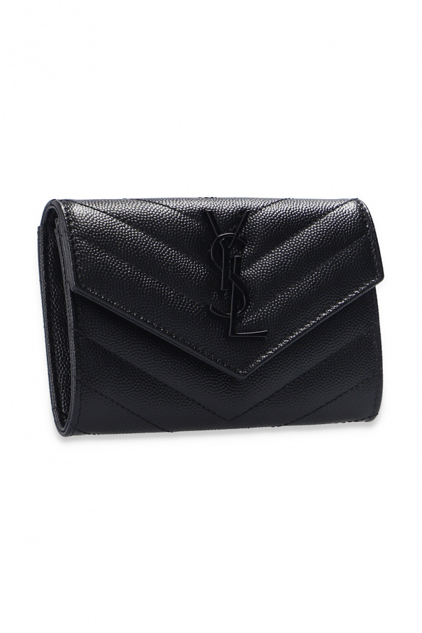 Black ‘Monogram Small’ quilted wallet from Saint Laurent. Crafted from calf leather, this item fastens via a snap and features black metal YSL initials on the front, a slip pocket on the back and an interior with one pocket and two card slots.