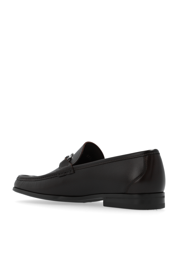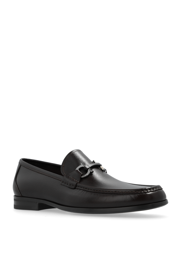 Dark brown ‘Grandioso2’ loafers from FERRAGAMO. Made from textured calf leather, this model sits on a dark brown rubber sole and showcases a silver-tone and dark brown Gancini application on the front and an extra-wide footbed.
