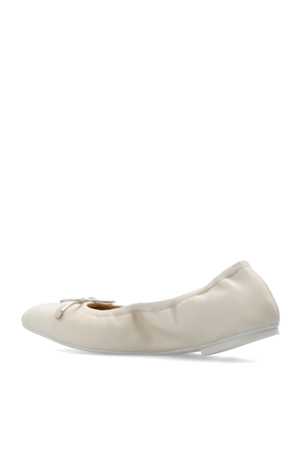 Cream ‘Bardot’ ballet flats from Stuart Weitzman. Made of leather, this model sits on a cream rubber sole and showcases a bow on the front.