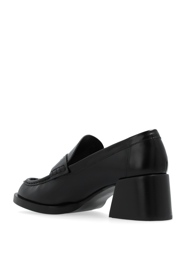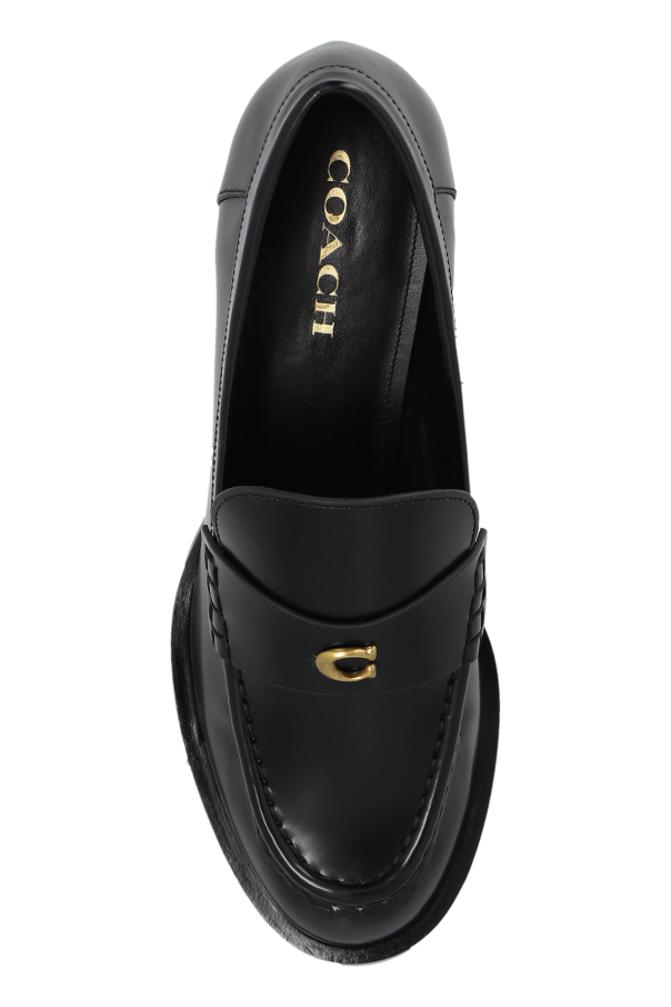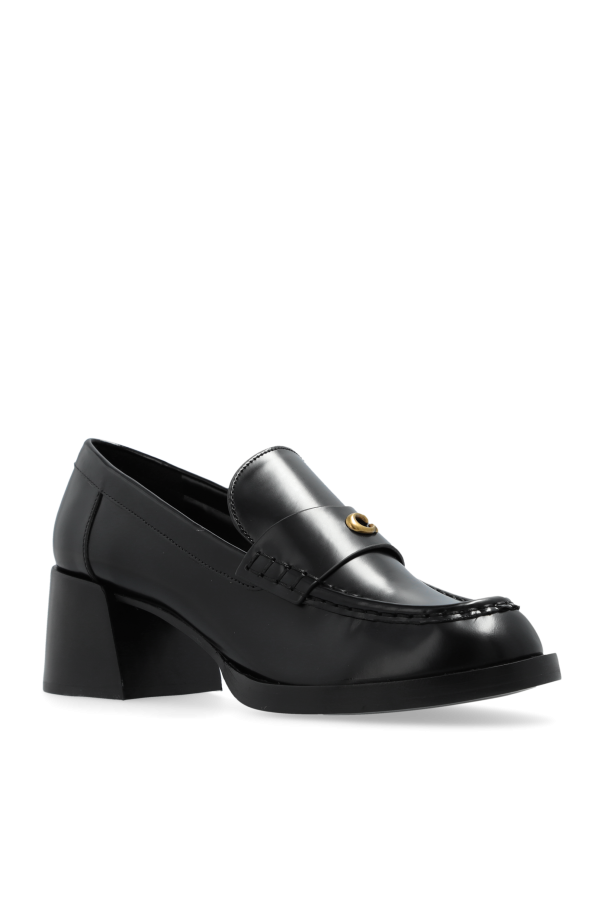 Introducing the \"Natalie\" heels from the exclusive collection by Coach, a testament to refined elegance and comfort. These black, classic loafers are meticulously crafted from 100% premium leather, ensuring both durability and a luxurious finish. The medium, stable block heel offers the perfect blend of comfort and poised elegance, making them ideal for a variety of occasions. The distinctiveness of the \"Natalie\" heels lies in their timeless design, featuring pronounced stitching and a rounded toe that exudes classical charm. The front of the shoe is adorned with a decorative, shimmering buckle, adding a touch of sophistication. This ornamental buckle, alongside the designer\'s logo embossed on the gold clasp and imprinted on the inner sole, unmistakably identifies the footwear as belonging to a luxurious segment of the fashion market. Constructed with a 100% leather outer and inner layer, and a sole made of equal parts rubber and leather, these shoes promise both comfort and style. Their versatility is further highlighted in various styling contexts, where they seamlessly blend with both elegant and casual attire, underscoring their adaptability. Why Purchase the \"Natalie\" Heels? Exclusive design by Coach, symbolizing luxury and sophistication. Constructed from 100% premium leather for durability and elegance. Medium, stable block heel ensures comfort without sacrificing style. Classic loafer silhouette with a modern twist, suitable for diverse occasions. Unique, decorative buckle and designer logo as hallmarks of luxury and exclusivity.