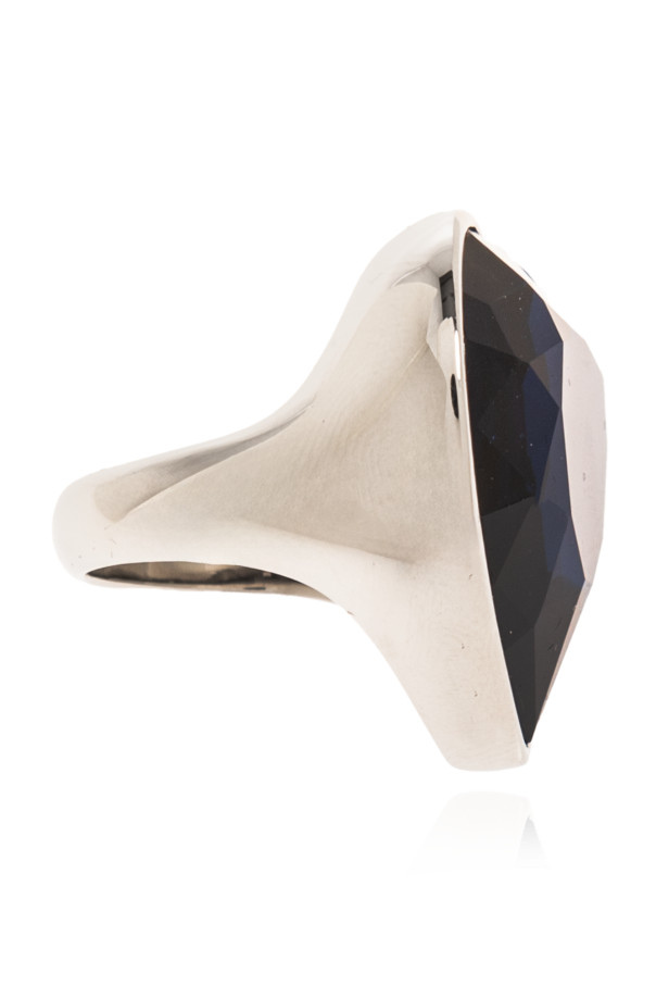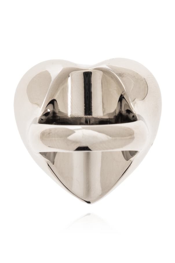 Silver-tone heart-shaped ring from VETEMENTS. Made of brass, this item showcases a blue crystal and an engraved logo.