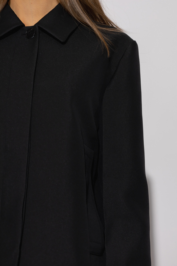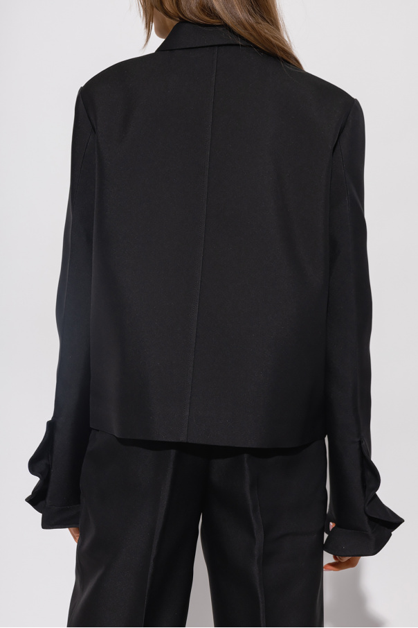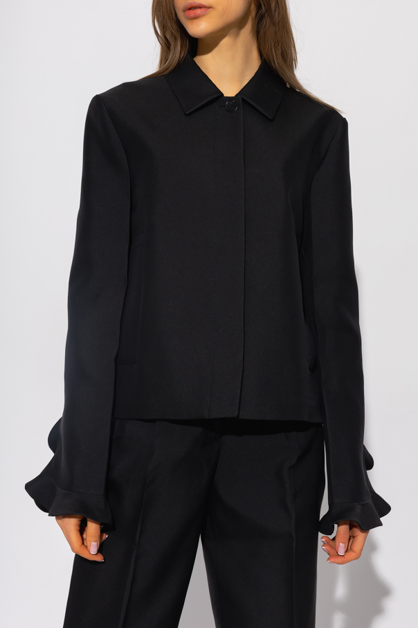 Black jacket from Jil Sander. Crafted from gabardine with a cropped, relaxed boxy fit, this style features button fastenings with a concealed placket, a collar fastener, two slip pockets and long sleeves accentuated with a ruffle.