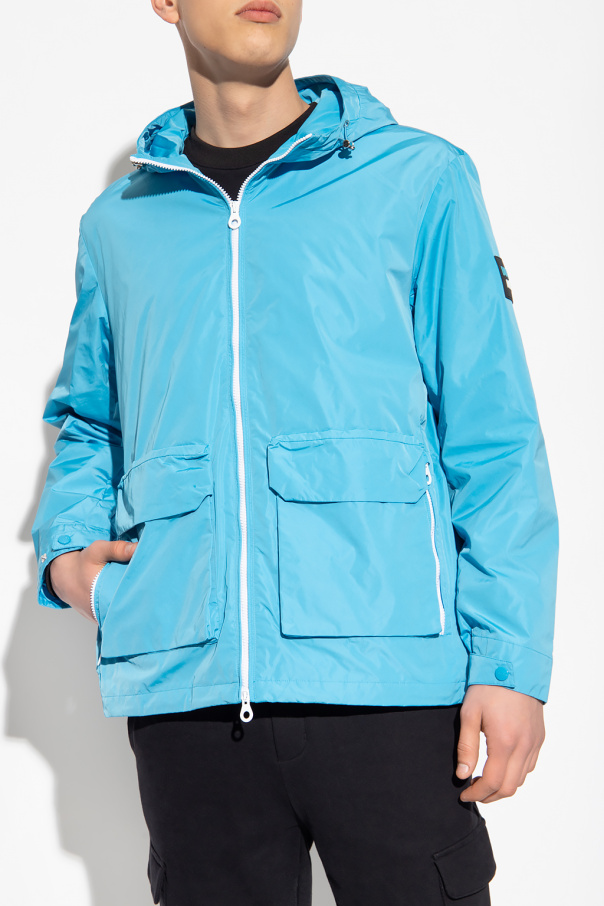 Light, blue ‘Varzo’ jacket from Duvetica. Fastened with a two-way zip, this design features a drawstring hood and hem, two zip pockets, two snap-fastened flap pockets and long sleeves with a rubber logo patch.