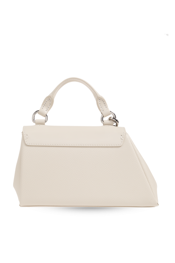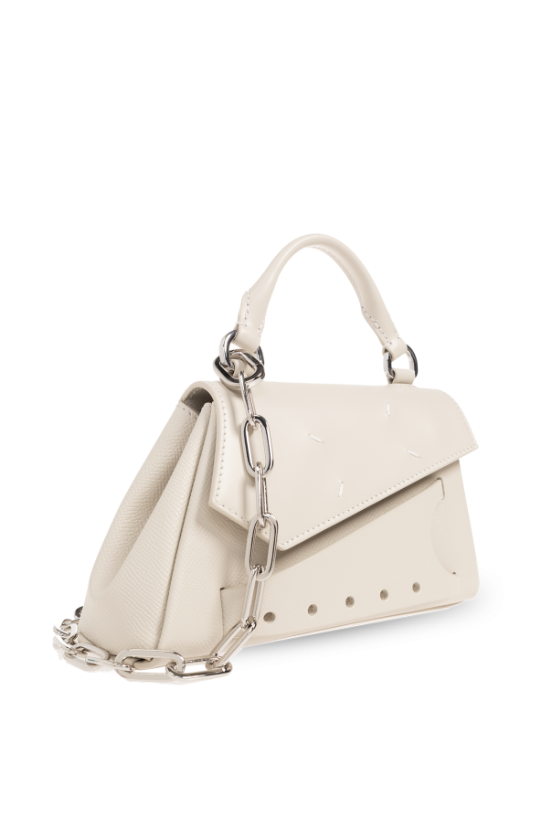 Greyish-cream ‘Snatched Micro’ shoulder bag from Maison Margiela. Made of calf leather with an asymmetrical silhouette, this design secures with a magnetic snap on the flap and showcases a decorative handle and the brand\'s signature white stitches on the front. It is complete with a detachable chain shoulder strap, one half-round handle, silver-tone metal hardware and one internal compartment with a slip pocket.