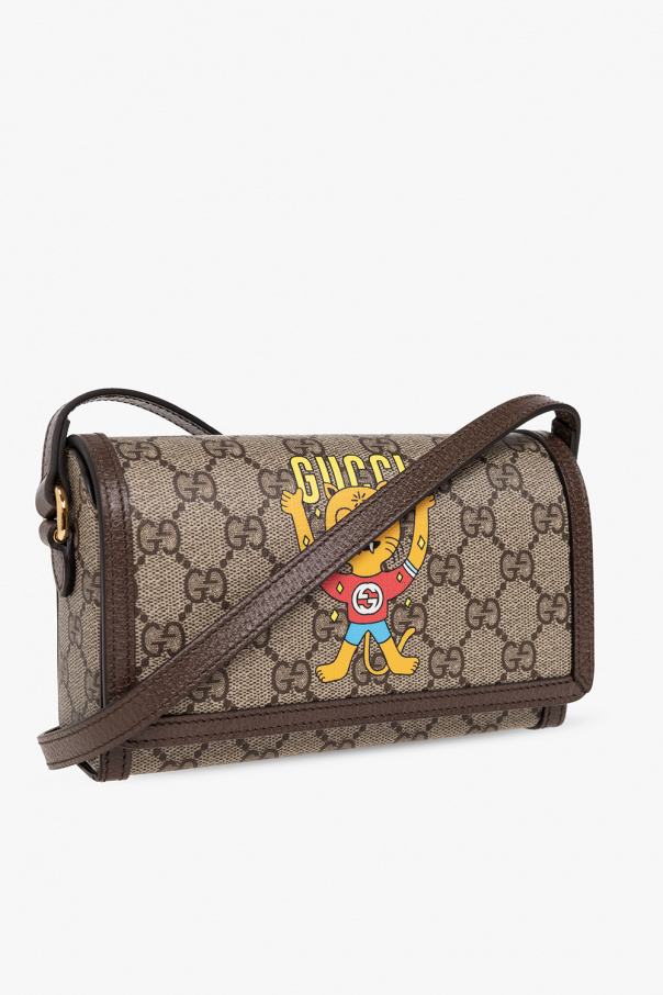 Brown and beige shoulder bag from Gucci x Pablo Delcielo. Made of the iconic GG Supreme canvas with leather trims, this item features a magnetic snap, yellow logo, adjustable shoulder strap, one internal compartment, gold-tone metal hardware and artwork by Chile based cartoonist and illustrator, Pablo Delcielo.