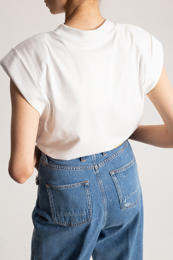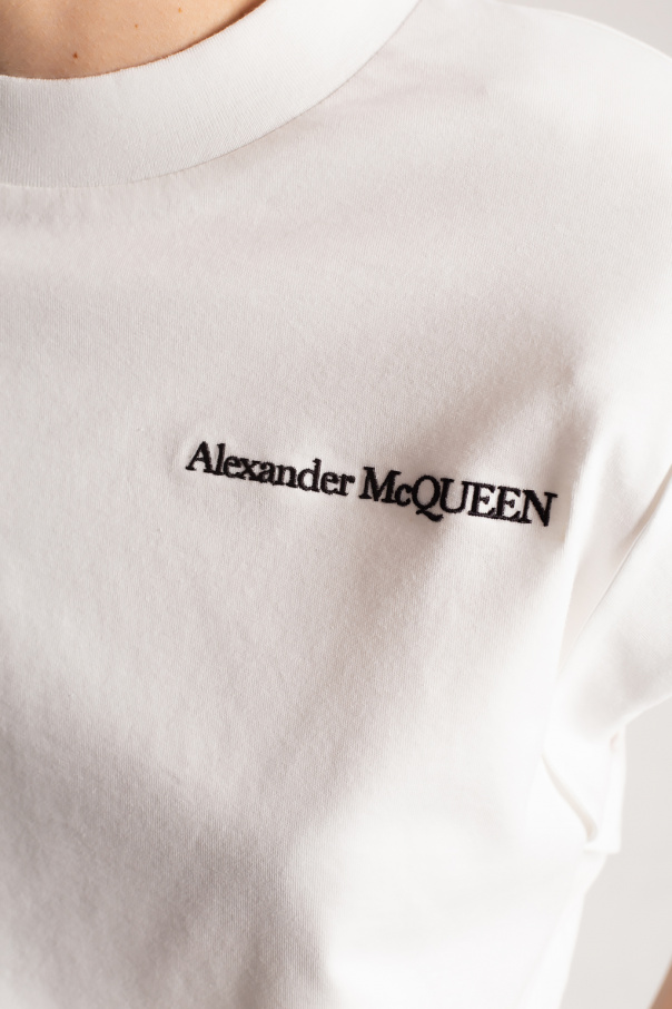 White two-layered crewneck T-shirt from Alexander McQueen. Made of cotton, this garment features a black logo embroidery and padded shoulders.