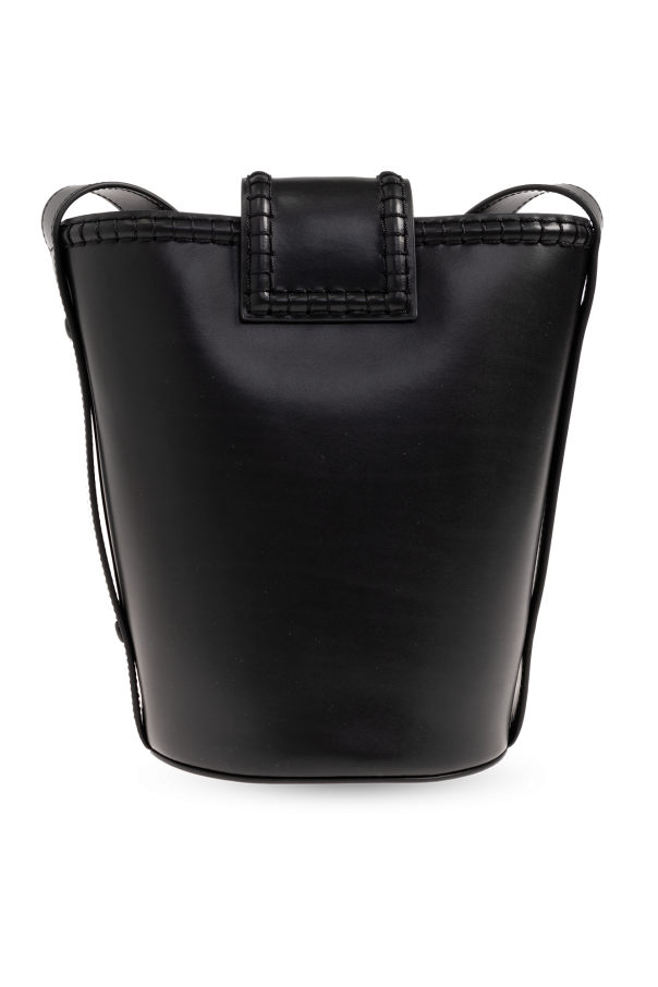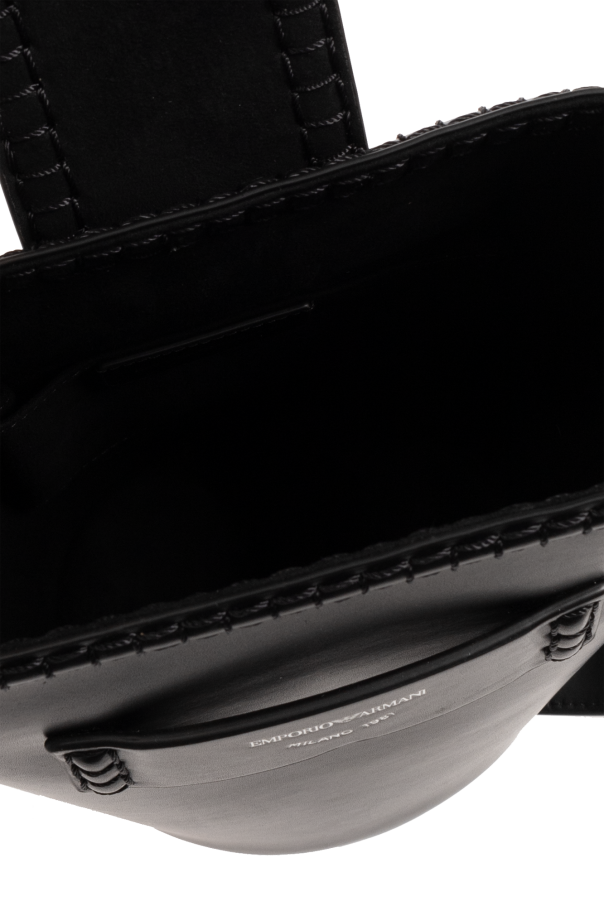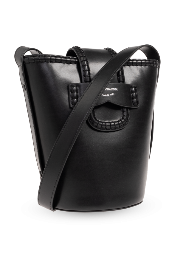 Black shoulder bag from Emporio Armani. Made of leather, this design fastens via a flap and showcases a printed silver-tone logo on the front. It is complete with a long and adjustable strap, silver-tone metal hardware and one internal compartment with a slip pocket.