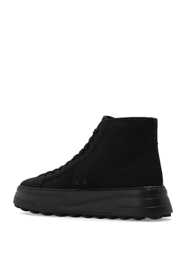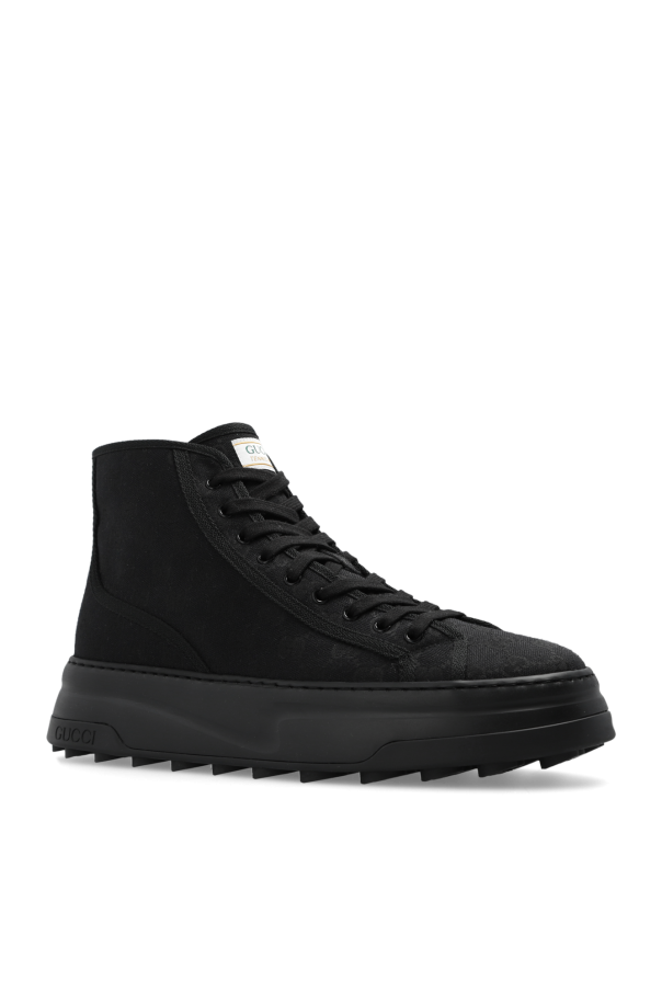 Black sneakers from Gucci. Crafted from ‘GG Supreme’ canvas, this lace-up model sits on a black rubber sole and showcases a logo pattern,