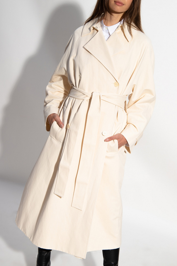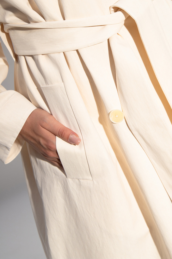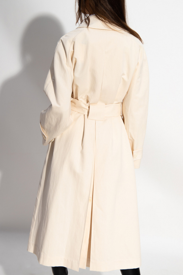 Cream double-breasted trench coat from The Row. Crafted from a cotton and linen blend with an oversize silhouette, this style features a wide wrap belt, two slip pockets, long sleeves with button cuff straps and a single back vent with a button closure.
