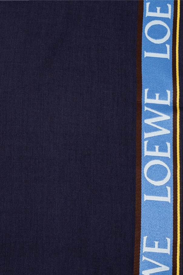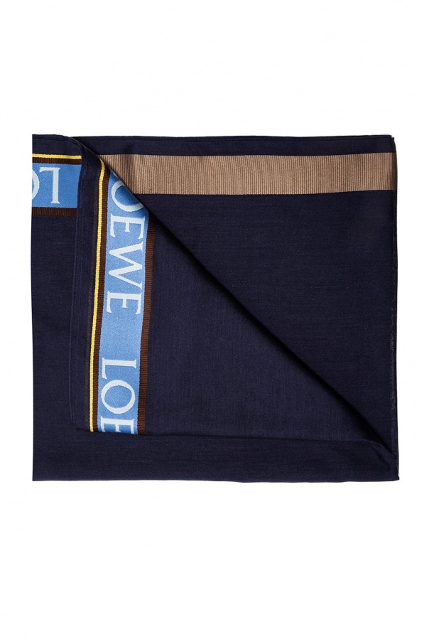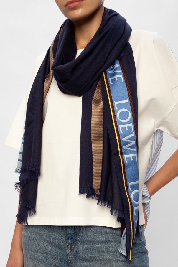Navy blue scarf from Loewe. Crafted from silk and cashmere blend, this accessory is complete with a light grey logo embroidery, maroon and yellow piping and fringe edges.